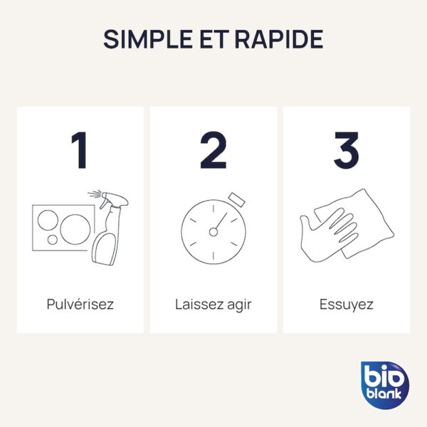 Prêt à l’emploi. Agiter avant emploi. Vaporiser le produit sur la surface à nettoyer, laisser agir. Essuyer avec une éponge Bio Blank ou une microfibre Bio Blank.